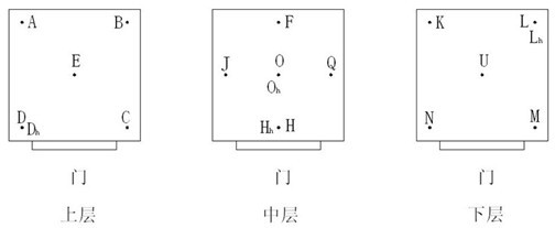 在被恒溫恒濕試驗箱工作室內(nèi)定出上、中、下三個水平層面(簡稱上、中、下三層),上層與工作室頂面的距離是工作室高度的1/10,中層通過工作室?guī)缀沃行狞cO,下層在底層樣品架上方10mm處。 恒溫恒濕試驗箱測量點分別位于上、中、下三層,如圖1和圖2。 溫度測量點用O、A、B、C、D、E、F、G、H、J、K、L、M、N、U表示。 相對濕度測量點用Oh、Dh、Hh、Lh表示。 工作室容積不大于2m3時,溫度測量點為9個,相對濕度測量點為3個