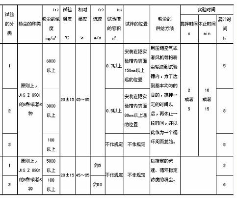 注 (1)所謂粉塵的“濃度”,是指粉塵在試驗(yàn)槽內(nèi)擴(kuò)散到基本穩(wěn)定狀態(tài)時(shí)的值。 (2)氣流的流速,在試件附近進(jìn)行測(cè)定。 (3)試驗(yàn)槽的容積規(guī)定為有效試驗(yàn)空間。