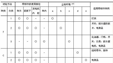 5. 適用基準(zhǔn) 塵埃試驗(yàn)的適用基準(zhǔn),按照零部件所處環(huán)境及零部件的使用部位進(jìn)行分類,原則上如表3所示。 附注 表中帶有圓圈符號(hào)“○”的欄目,表示適用的場(chǎng)合。 6、評(píng)價(jià) 按照“4.”進(jìn)行試驗(yàn),檢查零部件的品質(zhì)、性能以及粉塵的侵入程度。 JIS D 0207-1997 汽車(chē)零部件的防塵及耐塵試驗(yàn)通則解說(shuō)